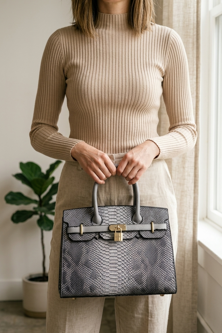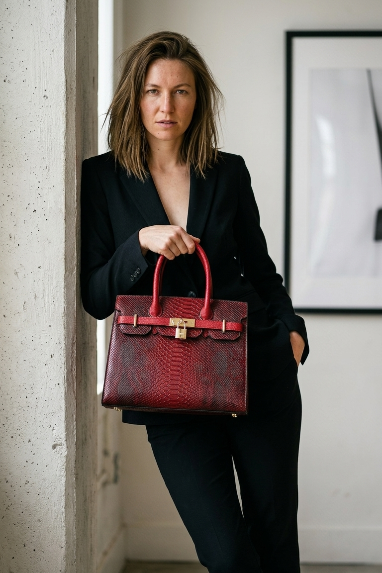 VAULTEX opens with a statement and closes with authority. Snake-embossed leather, a polished gold padlock front, and a rigid structured silhouette that screams luxury without saying a word. In sleek black, rich burgundy, classic tan, or any shade you choose — this is the bag that means business in every color.